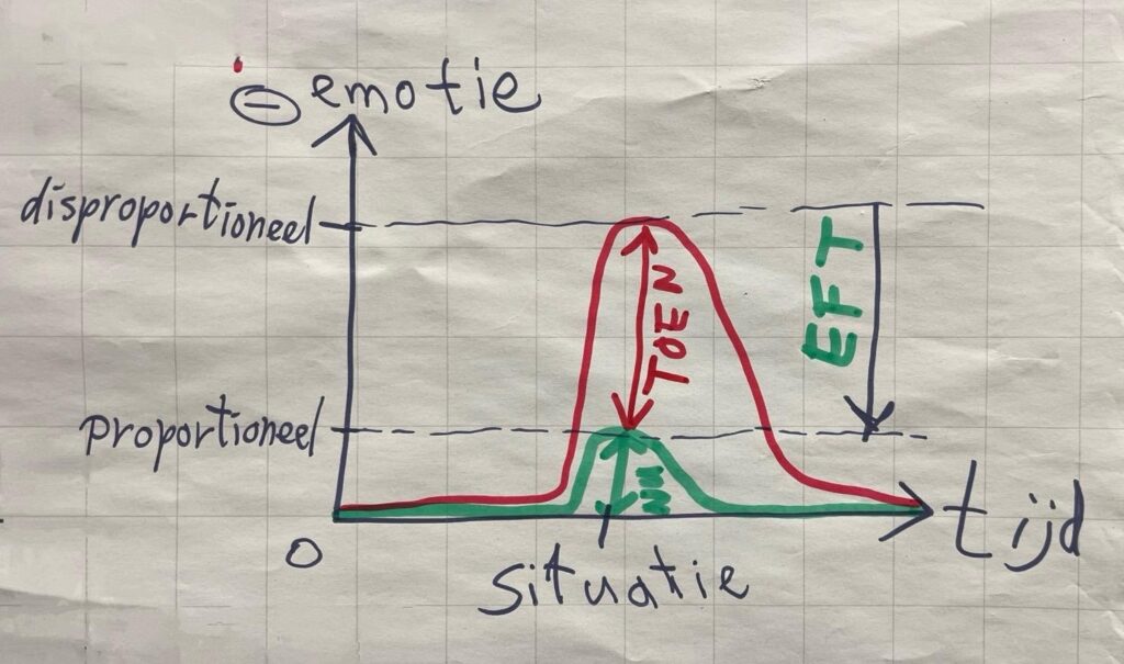 Door een opeenstapeling van negatieve ervaringen kan de emotionele reactie op een situatie disproportioneel worden (zie figuur 2). EFT kalmeert het zenuwstelsel en haalt stap voor stap de lading van de emotie af. Het werkt als een kaasschaaf: hoe groter en ouder het thema, hoe meer herhaling nodig is.